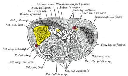| Keywords: Gray422 - Trapezium.png en Transverse section across the wrist Palm on top thumb on left Trapezium is shown in yellow labelled as Greater Multang Other fields 1 Information field Ucfirst Plate 422 before 1858 Henry Gray Anatomy of the Human Body See Book section below 422 Creator Henry Vandyke Carter thumb left Original Book Gray's Anatomy PD-old-100-1923 Gray's Anatomy plates 0422 Trapezium bone | ||||