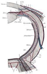 | Keywords: Gray877.png en Gray's Anatomy plate Diagram of the blood vessels of the eye as seen in a horizontal section Leber after Stöhr <br> Course of vasa centralia retinæ a Arteria; a<sub>1</sub> Vena centralis retinæ; B Anastomosis with vessels of outer coats; C Anastomosis with branches of short posterior ciliary arteries; D Anastomosis with chorioideal vessels <br> Course of vasa ciliar postic brev I Arteriæ and I<sub>1</sub> Venæ ciliar postic brev ; II Episcleral artery; II<sub>1</sub> Episcleral vein; III Capillaries of lamina choriocapillaris <br> Course of vasa ciliar postic long 1 a ciliar post longa; 2 Circulus iridis major cut across; 3 Branches to ciliary body; 4 Branches to iris <br> Course of vasa ciliar ant a Arteria a1 Vena ciliar ant ; b Junction with the circulus iridis major; c Junction with lamina choriocapill; d Arterial and d<sub>1</sub> Venous episcleral branches; e Arterial and e<sub>1</sub> Venous branches to conjunctiva scleræ; f Arterial and f<sub>1</sub> Venous branches to corneal border V Vena vorticos; S Transverse section of sinus venosus scleræ Other fields 1 Information field Ucfirst Plate 877 before 1858 Henry Gray Anatomy of the Human Body See Book section below 877 Creator Henry Vandyke Carter File Gray877 rotated jpg Book Gray's Anatomy PD-old-100-1923 Gray's Anatomy plates 0877 |
