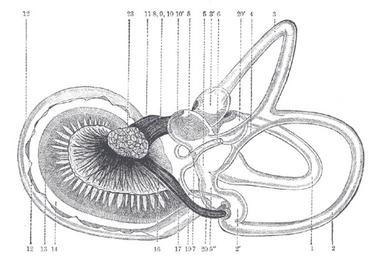 | Keywords: Gray926.png The same from the postero-medial aspect 1 Lateral semicircular canal; 1 its ampulla; 2 Posterior canal; 2 its ampulla 3 Superior canal; 3 its ampulla 4 Conjoined limb of superior and posterior canals sinus utriculi superior 5 Utricle 5 Recessus utriculi 5 Sinus utriculi posterior 6 Ductus endolymphaticus 7 Canalis utriculosaccularis 8 Nerve to ampulla of superior canal 9 Nerve to ampulla of lateral canal 10 Nerve to recessus utriculi in Fig 925 the three branches appear conjoined 10 Ending of nerve in recessus utriculi 11 Facial nerve 12 Lagena cochleæ 13 Nerve of cochlea within spiral lamina 14 Basilar membrane 15 Nerve fibers to macula of saccule 16 Nerve to ampulla of posterior canal 17 Saccule 18 Secondary membrane of tympanum 19 Canalis reuniens 20 Vestibular end of ductus cochlearis 23 Section of the facial and acoustic nerves within internal acoustic meatus the separation between them is not apparent in the section G Retzius Other fields 1 Information field Ucfirst Plate 926 before 1858 Henry Gray Anatomy of the Human Body See Book section below 926 Creator Henry Vandyke Carter Book Gray's Anatomy PD-old-100-1923 Gray's Anatomy plates 0926 Inner ear Sensory Neuroscience Hearing and speech Anatomical plates and drawings of the human ears |