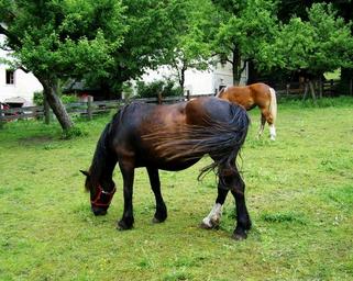 Keywords: grazing horse dark brown horse animal