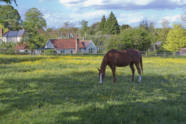 Keywords: grazing mare white blaze meadow buttercups post and rail fence grass green rural sunshine shade cloud sunlight