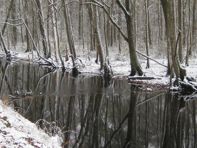 Keywords: great dismal swamp winter snow landscape nature trees water scenic lonely woods river north carolina usa