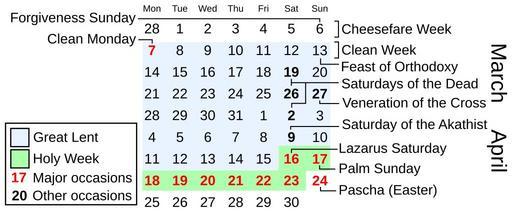 | Keywords: Great Lent in March-April 2011.svg en Shows Great Lent in March/April of 2011 as observed in Eastern denominations along with many of the named days In Eastern denominations Lent covers the days marked with a blue background from Clean Monday through the Friday before Lazarus Saturday For Western denominations see File Lent in March-April 2011 svg Based on File 2011 calendar svg User Dcoetzee Nevit Dilmen <span class signature-talk >talk</span> 2012-08-02 <gallery> File 2011 calendar svg </gallery> Lent fasting period Cc-zero |