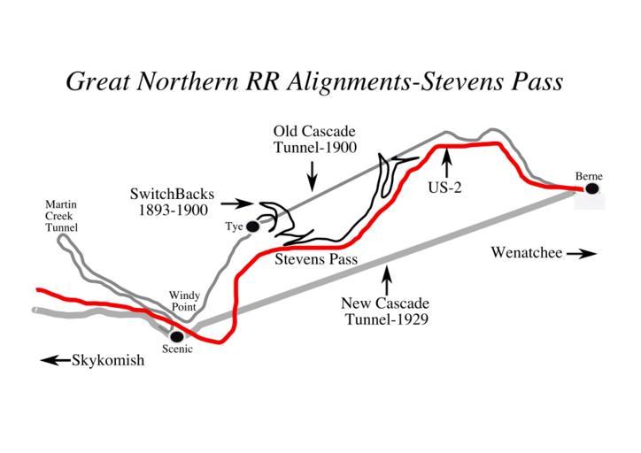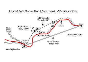 Keywords: Great Northern RR Alignments-Stevens Pass.svg en Diagram of railroad paths across Stevens Pass WA Own Francisbausch 2009-03-27 GFDL relicense Rail transport in Washington state Stevens Pass Washington Cascade Tunnel Cascade Tunnel 1900