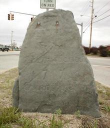 | Keywords: Great Road 12 miles from Providence.jpg Milestone 12 miles from Providence on the Great Road now Route 146A Taken April 20 2002 by User SPUI I also have a few closeups of the text which are slightly more legible Here is what the stone says <center>12 Miles<br>From<br>Providence<br>1774<br>Galeb Aldrich<br>Stone</center> own SPUI spuiphoto Milestones in the United States Route 146A Rhode Island North Smithfield Rhode Island | ||||