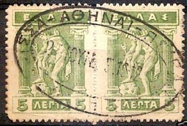 | Keywords: Greece litho1913-2x5L-RPO postmark.jpg en Postage stamp of 1913 Lithographic issue pair of 5 lepta with Railway Post Office Larissa-Athens-Piraeus postmark Own collection Design by G Iakovides 1853-1932 I Svoronos 1863-1922 Printed by G Aspiotis Bros 1913 1913 PD-old-70 Stamps of Greece 1911 1913 stamps Postmarks of Greece Railway post offices 1912 postmarks 1913 in Greece | ||||