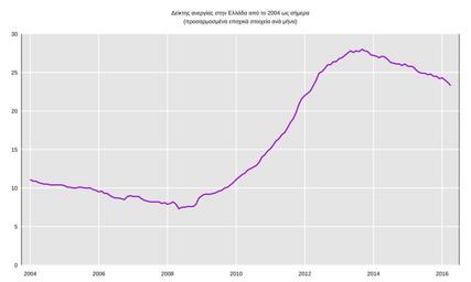| Keywords: Greece-unemployment-2004-present-el.svg en Unemployment rate in Greece from 2004 to today Data from Hellenic Statistical Authority http //www statistics gr/el/statistics/-/publication/SJO02/- monthly data seasonally adjusted el Δείκτης ανεργίας στην Ελλάδα α ό το 2004 ως σήμερα Δεδομένα α ό την Ελληνική Στατιστική Αρχή ΕΛ ΣΤΑΤ http //www statistics gr/el/statistics/-/publication/SJO02/- ανά μήνα ε οχικά ροσαρμοσμένα 2014-01-03 02 20 53 own CubicStar Source code Graph produced by a Gnuplot script data is inlined for better reproduction <source lang gnuplot > Terminal set terminal svg enhanced size 1000 600 fname Arial sans fsize 12 set output Greece-unemployment-2004-present-el svg Data and formats set datafile missing - set datafile separator set xdata time set timefmt Y- m set format x Y Scale and ranges set autoscale set xrange 2003-10 2016-07 set yrange 0 30 Ticks borders and title set border 0 linewidth 0 set xtics autofreq nomirror set ytics autofreq nomirror set grid xtics back linetype 1 linewidth 3 linecolor rgb ffffff set grid x2tics back linetype 1 linewidth 2 linecolor rgb ffffff set grid ytics back linetype 1 linewidth 3 linecolor rgb ffffff set grid y2tics back linetype 1 linewidth 2 linecolor rgb ffffff set object 1 rectangle \ from graph 0 graph 0 to graph 1 graph 1 \ behind \ fillcolor rgb e5e5e5 \ fillstyle solid 1 0 Title translation Unemployment rate in Greece 2004-today\n Seasonally adjusted data per month set title Δείκτης ανεργίας στην Ελλάδα α ό το 2004 ως σήμερα\n ροσαρμοσμένα ε οχικά στοιχεία ανά μήνα Plot plot - using 1 2 with lines linewidth 2 5 title space-delimited data start month adjusted 2004-01 11 1 2004-02 10 9 2004-03 10 9 2004-04 10 7 2004-05 10 6 2004-06 10 5 2004-07 10 5 2004-08 10 4 2004-09 10 4 2004-10 10 4 2004-11 10 4 2004-12 10 4 2005-01 10 3 2005-02 10 1 2005-03 10 1 2005-04 10 0 2005-05 10 0 2005-06 10 1 2005-07 10 1 2005-08 10 0 2005-09 10 0 2005-10 10 0 2005-11 9 8 2005-12 9 7 2006-01 9 5 2006-02 9 6 2006-03 9 3 2006-04 9 3 2006-05 9 0 2006-06 8 8 2006-07 8 7 2006-08 8 7 2006-09 8 6 2006-10 8 5 2006-11 8 9 2006-12 9 0 2007-01 8 9 2007-02 8 9 2007-03 8 9 2007-04 8 6 2007-05 8 4 2007-06 8 3 2007-07 8 2 2007-08 8 2 2007-09 8 2 2007-10 8 2 2007-11 8 0 2007-12 8 1 2008-01 7 9 2008-02 8 0 2008-03 8 2 2008-04 7 9 2008-05 7 3 2008-06 7 5 2008-07 7 5 2008-08 7 6 2008-09 7 6 2008-10 7 6 2008-11 7 9 2008-12 8 7 2009-01 9 0 2009-02 9 2 2009-03 9 2 2009-04 9 2 2009-05 9 3 2009-06 9 4 2009-07 9 6 2009-08 9 7 2009-09 10 0 2009-10 10 1 2009-11 10 4 2009-12 10 7 2010-01 11 1 2010-02 11 4 2010-03 11 7 2010-04 11 9 2010-05 12 3 2010-06 12 5 2010-07 12 7 2010-08 12 9 2010-09 13 3 2010-10 14 0 2010-11 14 3 2010-12 14 8 2011-01 15 1 2011-02 15 6 2011-03 16 1 2011-04 16 4 2011-05 16 9 2011-06 17 2 2011-07 17 8 2011-08 18 5 2011-09 19 0 2011-10 19 8 2011-11 20 9 2011-12 21 6 2012-01 22 0 2012-02 22 3 2012-03 22 6 2012-04 23 3 2012-05 24 0 2012-06 24 9 2012-07 25 1 2012-08 25 5 2012-09 26 0 2012-10 26 0 2012-11 26 4 2012-12 26 4 2013-01 26 8 2013-02 26 9 2013-03 27 2 2013-04 27 5 2013-05 27 8 2013-06 27 6 2013-07 27 8 2013-08 27 7 2013-09 28 0 2013-10 27 8 2013-11 27 7 2013-12 27 3 2014-01 27 2 2014-02 27 1 2014-03 26 9 2014-04 27 1 2014-05 27 0 2014-06 26 7 2014-07 26 3 2014-08 26 2 2014-09 26 1 2014-10 26 1 2014-11 25 9 2014-12 26 1 2015-01 25 8 2015-02 25 8 2015-03 25 7 2015-04 25 3 2015-05 25 0 2015-06 24 9 2015-07 24 9 2015-08 24 7 2015-09 24 8 2015-10 24 5 2015-11 24 5 2015-12 24 2 2016-01 24 3 2016-02 24 0 2016-03 23 7 2016-04 23 3 data end </source> cc-zero Unemployment in Greece |