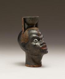 | Keywords: Greek - Aryballos in the Form of Head of an African - Walters 482017 - Three Quarter Right.jpg This aryballos is in the shape of an African head It has a hemispherical mouth with a straight support rectangular in section on either side The mouth is glazed black outside and inside and is painted with red over black on top of the rim The supports are painted black on three sides and red over black on the outside The body is painted black The back of the head is smooth the lips are red the irises of the eyes are white the interior of the ears are white and red Added clay dots for the hair are painted red with slight traces of white The piece has an oval base with a reserved underside and a red band on the outside at the bottom of the vessel There is not another head vase known quite like this one The date of the vase is difficult to determine for the form of the mouth and its supports are typical of examples from the late archaic but the modelling of the face in respect to style is not far removed from the work of Sotades who was active around 460-450 BC ca 480 430 BC Classical terracotta H overall 3 5/8 x W 1 13/16 x D 2 9/16 in 9 2 x 4 65 x 6 55 cm ; Diam at mout cm 3 1 ; Diam at mouth with supports cm 3 8 ; W at base 1 3/16 x D 1 1/4 in 2 95 x 3 15 cm accession number 48 2017 4096 Joseph Brummer New York date and mode of acquisition unknown Joseph Brummer Sale New York 1949 Pt III no 2 Walters Art Museum 1949 by purchase Museum purchase 1949 place of origin Attica Greece Walters Art Museum license Ancient Greek pottery in the Walters Art Museum Ancient Greek pottery aryballoi Media contributed by the Walters Art Museum needs category review Attic red-figure pottery |