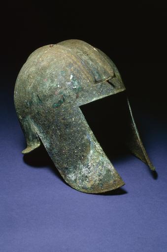 Keywords: Greek - Assemblage from a Warrior's Burial - Walters 542456 - Three Quarter.jpg This helmet with a mask separate nose piece band ring and plaque were found with other bronze armor in a tomb in northern Greece The helmet cast with beaded and incised edges is of a type possibly developed in the Peloponnese in the 7th century BC and later used in Illyria a region northwest of Greece and other foreign lands The other objects are made of hammered sheet gold century 6 BC Archaic bronze cm 24 19 25 accession number 54 2456 14843 Tomb in Chalkidike Northern Greece Hesperia Art Philadelphia Walters Art Museum 1964 by purchase Museum purchase with funds provided by the S A P Fund 1964 place of origin Thrace in present-day Chalcidice Greece Walters Art Museum license Ancient Greek art in the Walters Art Museum Armour in the Walters Art Museum Art from Greece Ancient Greek helmets Bronze armour |