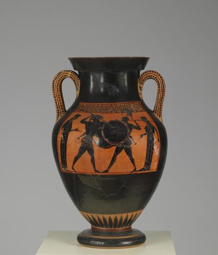 MAKE A MEME View Large Image Greek - Black-figure Amphora - Walters 4810 - Side A.jpg This vase depicts two warriors in combat flanked by two women on side A and three kneeling Greek warriors and three standing bowmen on side B ca 530 BC terracotta H 22 1/4 x W 13 3/8 ...