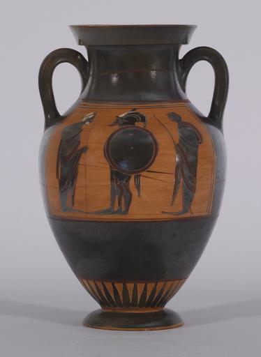 Keywords: Greek - Black-Figure Amphora - Walters 4813 - Side A.jpg This vase may portray the common departure scene of two warriors in full armor leaving home for war or it may represent a famous scene from The Iliad in which Priam king of Troy comes to claim and pay ransom for the body of his son Hector Achilles who killed Hector in single combat greets the elderly king Witnessing this scene are a second warrior who stands next to Achilles and another man standing behind ca 520 510 BC Archaic terracotta cm 32 3 20 5 accession number 48 13 10431 Don Marcello Massarenti Collection Rome no 231 Henry Walters city Baltimore Walters Art Museum Henry Walters Acquired by Henry Walters with the Massarenti Collection 1902 place of origin Athens Greece Walters Art Museum license Ancient Greek black-figure pottery in the Walters Art Museum Art from Greece Achilles in ancient Greek pottery Ransom of Hector Media contributed by the Walters Art Museum needs category review Priam in ancient Greek pottery