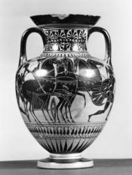| Keywords: Greek - Black-Figure Amphora - Walters 4820 - View A.jpg The central figures on one side of this vase are a seated man holding a staff who faces an armed woman-indicated by the white skin-leading a horse They could be Priam the king of Troy described in the Iliad receiving Penthesilea an Amazon queen She fought against the Greeks in the Trojan War and was killed by Achilles The other side of the vessel shows a charioteer in the process of turning his chariot around while two foot soldiers on either side flee from the rearing horses between 550 500 BC terracotta cm 26 2 17 accession number 48 20 23904 Dikran Kelekian New York and Paris date and mode of acquisition unknown Henry Walters city Baltimore Walters Art Museum Henry Walters Acquired by Henry Walters 1925 place of origin Attica Greece Walters Art Museum license Ancient Greek black-figure pottery in the Walters Art Museum Art from Greece Quadriga Media contributed by the Walters Art Museum needs category review |