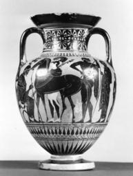 | Keywords: Greek - Black-Figure Amphora - Walters 4820 - View B.jpg The central figures on one side of this vase are a seated man holding a staff who faces an armed woman-indicated by the white skin-leading a horse They could be Priam the king of Troy described in the Iliad receiving Penthesilea an Amazon queen She fought against the Greeks in the Trojan War and was killed by Achilles The other side of the vessel shows a charioteer in the process of turning his chariot around while two foot soldiers on either side flee from the rearing horses between 550 500 BC terracotta cm 26 2 17 accession number 48 20 23904 Dikran Kelekian New York and Paris date and mode of acquisition unknown Henry Walters city Baltimore Walters Art Museum Henry Walters Acquired by Henry Walters 1925 place of origin Attica Greece Walters Art Museum license Ancient Greek black-figure pottery in the Walters Art Museum Art from Greece Media contributed by the Walters Art Museum needs category review |
