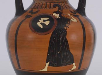 | Keywords: Greek - Black-figure Pseudo-Panathenaic Amphora - Walters 482107 - Detail A.jpg The image on the obverse of this amphora may represent the mousikoi agones or musical competitions of the Panathenaic festival Bundrick 2005 160-74 In the center of the scene a bearded man clad in an ankle-length white chiton stands on a bema or podium Facing right he holds a large seven-stringed kithara in this left hand With his right hand he plays the instrument using a plectrum attached by a string The kithara's cover hangs below Added white paint has been applied to the arms of the elaborate kithara to simulate ivory One man stands on either side of the bema perhaps representing spectators trainers or judges of the competition The kithara was a highly esteemed instrument in Archaic Greece and both Apollo and Orpheus were mythological models for human performers Shapiro 1992 69 Herodotus 1 23-24 reports the story of Arion a highly regarded and successful kitharode who was thrown overboard from a ship by men who conspired to rob him According to the tale Arion was saved by a dolphin and returned to shore unharmed which suggests that kitharodes were believed to have enjoyed the patronage of Apollo The image on this vase finds a heroic counterpart in the representation of Herakles Mousikos in which the hero appears as the performer often with Olympic deities as spectators On the amphora's obverse Athena strides to the left wearing her characteristic helmet and scaly aegis The goddess wields a spear and holds a large shield decorated with a soaring eagle Two Doric columns each with a rooster perched on top flank the goddess This is the standard configuration for one side of the Panathenaic amphora which was given as a prize at the quadrennial games in honor of the patron goddess of Athens However the size of this vase and the lack of an inscription indicate that it was not actually used as a prize ca 500 485 BC terracotta cm 44 26 9 accession number 48 2107 3696 William Randoph Hearst San Simeon date and mode of acquisition unknown Garrett Chatfield Pier Sale Anderson Galleries 1958 Walters Art Museum 1958 by purchase Museum purchase 1958 Heroes Mortals and Myths in Ancient Greece The Walters Art Museum Baltimore; Frist Center for the Visual Arts Nashville; San Diego Museum Of Art San Diego; Alexander S Onassis Public Benefit Foundation USA New York 2009-2011 place of origin Attica Greece Walters Art Museum license Ancient Greek black-figure pottery in the Walters Art Museum Pseudo-Panathenaic amphoras Art from Greece Media contributed by the Walters Art Museum needs category review |