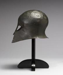 | Keywords: Greek - Corinthian Helmet - Walters 542304 - Profile.jpg This piece of armor is an element of the hoplite's panoply which also included a breastplate greaves shield spear and sword The nose-guard and cheekpieces of the undecorated crestless Corinthian helmet left only the eyes and mouth of its wearer exposed The small holes around the edge of the helmet anchored a leather lining that would have been sewn inside the helmet This was the most common form of helmet among hoplites This helmet may have been killed or rendered unusable by bending the cheekpieces outward This type of distortion is common among helmets dedicated in sanctuaries between 700 500 BC Archaic bronze cm 24 3 20 8 25 7 accession number 54 2304 26335 Mr E Segredakis New York New York date and mode of acquisition unknown Walters Art Museum January 15 1946 by purchase Museum purchase with funds provided by the S A P Fund 1946 Heroes Mortals and Myths in Ancient Greece The Walters Art Museum Baltimore; Frist Center for the Visual Arts Nashville; San Diego Museum Of Art San Diego; Alexander S Onassis Public Benefit Foundation USA New York 2009-2011 place of origin Corinth Greece Walters Art Museum license Ancient Greek art in the Walters Art Museum Armour in the Walters Art Museum Art from Greece Corinthian helmets |