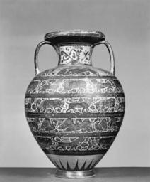 | Keywords: Greek - Early Corinthian Amphora with Real and Fantastic Animals - Walters 482033.jpg Corinth dominated the 7th-century BC pottery industry Corinthian vases are recognized by their repetitive friezes with animals of Near Eastern inspiration Here panthers bulls goats deer lions and swans appear side-by-side with mythical beings including sirens By the time this amphora was made such Corinthian vessels were mass-produced The abstract shape of the rosettes around the animals dates this piece to the late 7th century BC between 625 600 BC terracotta cm 44 4 30 accession number 48 2033 7078 Henry G Marquand New York date and mode of acquisition unknown Henry G Marquand Sale American Art Galleries New York 1902 no 972 Robert Garrett Baltimore by purchase Kende Galleries New York The Robert Garrett Collection Sale October 6 1951 no 96 Walters Art Museum 1951 by purchase Museum purchase 1951 In Search of Ancient Treasure 40 Years of Collecting The Walters Art Gallery Baltimore 1978 place of origin Corinth Greece Walters Art Museum license Ancient Greek black-figure pottery in the Walters Art Museum Ancient Greek Neck amphoras Media contributed by the Walters Art Museum needs category review |