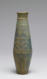 | Keywords: Greek - Flask with Figures and Lotus - Walters 48370 - View B.jpg Made by Greek artisans in the flourishing Hellenic trading colony of Naucratis in Egypt's delta this flask's low relief decoration and darker shade of glaze in the background are characteristic of faience ware produced here The shape of the vessel the frieze of men running and the lotus pattern were inspired by traditional Egyptian motifs century 3 2 BC Hellenistic-Ptolemaic Egyptian faience cm 16 6 5 5 h x diam accession number 48 370 16532 Dikran Kelekian Paris and New York Henry Walters city Baltimore Walters Art Museum Henry Walters Acquired by Henry Walters 1924 From Alexander to Cleopatra Greek Art of the Hellenistic Age The Walters Art Gallery Baltimore 1988-1989 place of origin Naucratis present-day Kom Gieif Egypt Walters Art Museum license Ancient Egyptian pottery in the Walters Art Museum Ancient Greek pottery in the Walters Art Museum Art from Greece Media contributed by the Walters Art Museum needs category review |