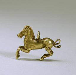 | Keywords: Greek - Greek Horse Pendant - Walters 571728 - Profile.jpg Horses figure prominently in Greek art and culture but this charming horse pendant marks a rare appearance of the motif in Greek jewelry The body was worked in two halves in repoussé over a mold while the forelegs ears tail and the suspension ring were created separately and soldered on century 3 1 BC Hellenistic gold cm 2 4 1 3 accession number 57 1728 26542 Henry Walters New York date and mode of acquisition unknown Sadie Jones Mrs Henry Walters New York 1931 by inheritance Sale Parke-Bernet Galleries New York December 2 1943 lot 517 Walters Art Museum 1943 by purchase Museum purchase with funds provided by the S A P Fund 1943 Jewelry - Ancient to Modern The Walters Art Gallery Baltimore 1979-1980 Bedazzled 5 000 Years of Jewelry from the Walters Art Museum Frist Center for the Visual Arts Nashville; The John and Mable Ringling Museum of Art Sarasota; The Walters Art Museum Baltimore 2006-2009 Bedazzled 5 000 Years of Jewelry El Paso Museum of Art El Paso 2010 place of origin Greece Walters Art Museum license Ancient Greek art in the Walters Art Museum Jewellery in the Walters Art Museum Art from Greece Media contributed by the Walters Art Museum needs category review |