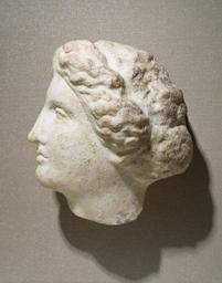 | Keywords: Greek - Head of a Woman - Walters 23220.jpg In the first decades of the 4th century artists further refined the representation of facial features the eyes became more deeply set the lower eyelid almost disappeared and the lips and chin became more delicate The serene expression the triangular shape of the forehead and the loosely carved locks of hair on this statue typify the 4th-century variations on the Classical ideal The head is from a grave monument and paint would have softened the roughened surface of the hair between 390 375 BC Classical marble cm 13 5 9 6 12 2 accession number 23 220 26049 Ludwig and Renata Edelstein date and mode of acquisition unknown Walters Art Museum Henry Walters Bequest of Ludwig and Renata Edelstein 1965 In Search of Ancient Treasure 40 Years of Collecting The Walters Art Gallery Baltimore 1978 From Alexander to Cleopatra Greek Art of the Hellenistic Age The Walters Art Gallery Baltimore 1988-1989 Pandora's Box Women in Classical Greece The Walters Art Gallery Baltimore; Dallas Museum of Art Dallas; Antikenmuseum Basel und Sammlung Ludwig Basel 1995-1996 place of origin Athens Greece Walters Art Museum license Ancient Greek sculptures in the Walters Art Museum Art from Greece Media contributed by the Walters Art Museum needs category review |