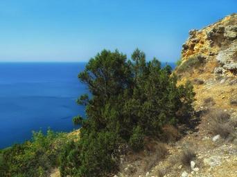 Keywords: greek juniper tree sea ocean cliff nature outside sky clouds scenic