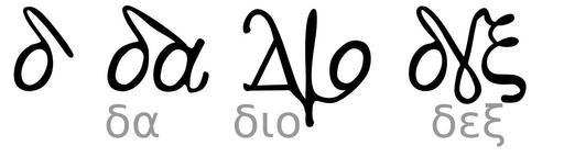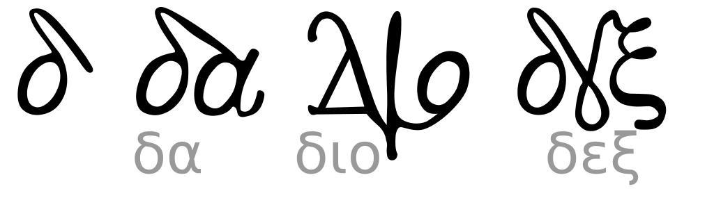 | Keywords: Greek minuscule Delta with ligatures.svg en Samples of ligatures involving Greek letter Delta in medieval minuscule handwriting and early modern printing own based on glyphs in the Rgreekl2 font made by Vernon Kooy http //schmidhauser us/tools/rgl/rgreekl2 pdf Fut Perf 2010-08-14 Delta letter Greek ligatures β |