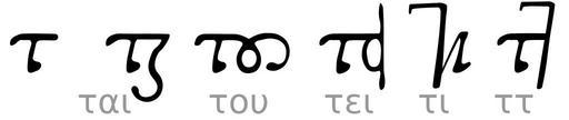 | Keywords: Greek minuscule Tau with ligatures.svg en Samples of ligatures involving Greek letter Tau in medieval minuscule handwriting and early modern printing own based on glyphs in the Rgreekl2 font made by Vernon Kooy http //schmidhauser us/tools/rgl/rgreekl2 pdf Fut Perf 2010-08-14 Tau letter Greek ligatures τ |