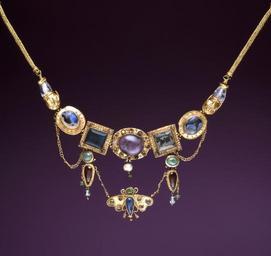 Keywords: Greek - Necklace with Butterfly Pendant - Walters 57386.jpg Elaborate diadems or necklaces featuring centerpieces of inlaid stones pendants and beaded chains go back to 3rd- and 2nd-century Greek jewelry This necklace was found on the neck of the deceased; as the symbol of the soul the butterfly was an appropriate motif for a burial gift late 2nd-1st century BC Hellenistic gold amethyst chalcedony emerald rock crystal pearl and colored glass cm 7 5 33 1 3 ; cm 32 7 l accession number 57 386 2800 Discovered in 1891 in a tomb near Olbia Parutino Ukraine Postnikov Moscow by purchase from a local dealer in Ukraine Spinks London by purchase around the turn of the century Peter Mavrogordato 1913 by purchase on the art market Collection of F L van Gans Frankfurt 1913-1921 by purchase Galerie Bachstitz The Hague Henry Walters Baltimore 1921-1931 by purchase Walters Art Museum Henry Walters Acquired by Henry Walters between 1921 and 1931 Jewelry - Ancient to Modern The Walters Art Gallery Baltimore 1979-1980 From Alexander to Cleopatra Greek Art of the Hellenistic Age The Walters Art Gallery Baltimore 1988-1989 place of origin Greece Walters Art Museum license Ancient Greek art in the Walters Art Museum Jewellery in the Walters Art Museum Art from Greece Media contributed by the Walters Art Museum needs category review Ancient Greek jewellery of Olbia Olbia Ukraine