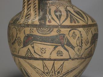 | Keywords: Greek - Oinochoe in the Camirus, or "Wild Goat" Style - Walters 482108 - Detail.jpg An oinochoe was used for serving wine This piece's style is usually termed Camirus after a site on the island of Rhodes where many examples have been found but they were actually made in the Greek cities of southern Asia Minor The horizontal rows of decoration filled with wild goats and floral motifs reflect influence from the civilizations of the ancient Near East The curving contours and combination of outlined shapes and solid black masses characterize this style distinguishing it from the angular silhouettes of the pottery from the preceding Geometric period ca 625 600 BC Archaic terracotta cm 34 3 22 8 accession number 48 2108 21177 William Randolph Hearst Easte Sale San Simeon 1958 no 5494 Walters Art Museum 1958 by purchase Museum purchase 1958 In Search of Ancient Treasure 40 Years of Collecting The Walters Art Gallery Baltimore 1978 Salviati and the Antique Ancient Inspiration for Modern Glassmaking The Walters Art Museum Baltimore 2007-2008 place of origin Asia Minor Walters Art Museum license Ancient Greek pottery in the Walters Art Museum Ancient Greek pottery oinochoes Media contributed by the Walters Art Museum needs category review |