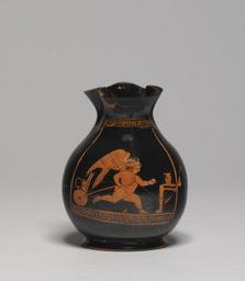 | Keywords: Greek - Red-Figure Chous with Eros - Walters 48206.jpg This small chous a vessel for wine would have been given as a gift to a young boy during the Athenian festival known as the Anthesteria celebrating the new wine Such vessels depict children at play often imitating adults Here a chubby Eros runs pulling a child's toy cart behind him He wears a wreath a spiked headdress and a string of amulets across his chest ca 410 BC Classical terracotta H 3 9/16 x Max Diam 2 3/4 in 9 01 x 7 cm accession number 48 206 2068 Joseph Brummer New York date and mode of acquisition unknown Henry Walters city Baltimore Walters Art Museum Henry Walters Acquired by Henry Walters 1929 Things With Wings Mythological Figures in Ancient Greek Art The Walters Art Museum Baltimore 2005-2006 place of origin Athens Greece Walters Art Museum license Ancient Greek red-figure pottery in the Walters Art Museum Art from Greece Anthesteria Eros in ancient Greek pottery |