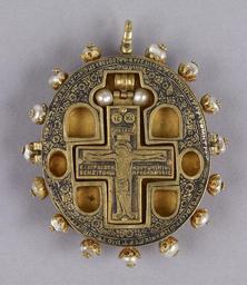 MAKE A MEME View Large Image Greek - Reliquary Pendant with Virgin and Child - Walters 571511 - Interior (2).jpg This exceptional pendant consists of a reliquary cross inside a hinged case with six small adjacent compartments for relics The impressive amethyst cameo ...