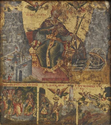 | Keywords: Greek - Saint Catherine of Alexandria with Three Scenes from Her Life - Walters 372753 - Detail.jpg According to legend Saint Catherine was a learned noble maiden from the Egyptian city of Alexandria who was martyred in the early 4th century on account of her Christian faith The three small scenes at the bottom of this panel illustrate episodes from her life the Roman empress is persuaded by Catherine to become a Christian; Catherine is beheaded by order of the pagan emperor; angels carry the saint's body to the top of a mountain on the Sinai Peninsula below is depicted the vision of Saint Eusthatius who was converted to Christianity when while hunting he saw a deer with a crucifix between its antlers The Monastery of Mount Sinai founded in the 6th century is now dedicated to Saint Catherine Its compound with two pilgrims approaching from the left is shown in the lower left corner of the upper larger composition Above it is Mount Sinai itself with several small chapels on its slopes and Moses receiving the Tablets of the Law on its summit Saint Catherine is portrayed in royal dress Two angels crown her with laurel wreaths and she holds a cross and a palm branch that signify her martyrdom for Christ To her right is a spoked wheel by means of which she was tortured before her execution Books compasses and an armillary sphere betoken Catherine's learning Behind them is Mount Catherine where the saint's body was miraculously rediscovered by the Sinai monks centuries after her death century 18 Early Modern tempera panel cm 15 88 15 24 approx accession number 37 2753 34067 Zoumboulakis Athens Greece by purchase Richard Howland Washington DC 1951 by purchase Walters Art Museum Gift of Richard Hubbard Howland 1998 Translation The empress came to believe in Christ The beheading of the saint The angels carried the saint s body to the mountain place of origin Greece Walters Art Museum license 2D Byzantine and Early Russian art in the Walters Art Museum Art from Greece Paintings in the Walters Art Museum Media contributed by the Walters Art Museum needs category review |