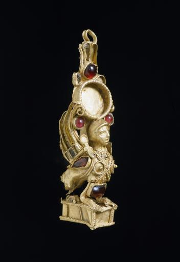 | Keywords: Greek - Sphinx - Walters 571490 - View A.jpg The elaborate earring depicts a Sphinx with a female head pronounced breasts and a bird's body with raised wings seated on a trapezoidal base She is heavily adorned with a necklace straps crossing between the breasts and multiple garnets The large central stone of her headdress is missing but above she is wearing the crown of the Egyptian goddess Hathor consisting of a sun-disc inscribed in cow horns with two plumes above Outside of the myths the apotropaic character of the Sphinx as well as of other monsters such as griffins sirens and the Medusa could transform them into guardians and protectors and make them in this case even into an appropriate motif for jewelry century 1 BC Hellenistic gold garnet cm 4 9 1 7 1 6 accession number 57 1490 9977 Henry Walters Baltimore date of acquisition unknown by purchase Walters Art Museum Henry Walters Acquired by Henry Walters Objects of Adornment Five Thousand Years of Jewelry from the Walters Art Gallery Baltimore Cooper-Hewitt National Design Museum New York; Chrysler Museum of Art Norfolk; Carnegie Museum of Art Pittsburgh; San Antonio Museum of Art San Antonio; Philbrook Museum of Art Tulsa; Honolulu Academy of Arts Honolulu; New Orleans Museum of Art New Orleans; Milwaukee Art Museum Milwaukee; Minneapolis Institute of Arts Minneapolis; Toledo Museum of Art Toledo; The John and Mable Ringling Museum of Art Sarasota 1984-1987 Heroes Mortals and Myths in Ancient Greece The Walters Art Museum Baltimore; Frist Center for the Visual Arts Nashville; San Diego Museum Of Art San Diego; Alexander S Onassis Public Benefit Foundation USA New York 2009-2011 Jewelry from the Walters Art Museum and the Zucker Family Collection The Walters Art Gallery Baltimore 1987 From Alexander to Cleopatra Greek Art of the Hellenistic Age The Walters Art Gallery Baltimore 1988-1989 Jewelry - Ancient to Modern The Walters Art Gallery Baltimore 1979-1980 place of origin Greece Walters Art Museum license Ancient Greek art in the Walters Art Museum Jewellery in the Walters Art Museum Ancient Greek jewellery Ancient Greek statues of sphinx |