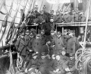 | Keywords: Greely relief expedition - labelled.jpg Greely Relief Expedition 1884 The six survivors of the U S Army's Greely Arctic expedition with their U S Navy rescuers at Upernavik Greenland 2-3 July 1884 Probably photographed on board USS Thetis Those present are as numbered on the original print 1 Commander Winfield S Schley USN commanding officer Greely Relief Expedition and of USS Thetis; 2 Lieutenant William H Emory Jr commanding officer of USS Bear; 3 Commander George W Coffin USN commanding officer of Steamer Alert; 4 Lieutenant Emory H Taunt USN Thetis; 5 Lieutenant Junior Grade Samuel C Lemly USN Thetis; 6 Lieutenant Freeman H Crosby USN Bear; 7 Lieutenant Junior Grade John C Colwell USN Bear; 8 Lieutenant Junior Grade Nathaniel R Usher USN Bear; 9 Lieutenant Junior Grade Charles J Badger USN Alert; 10 Lieutenant Junior Grade Henry J Hunt USN Alert; 11 Ensign Washington I Chambers USN Thetis; 12 Ensign Charles H Harlow USN Thetis; 13 Ensign Lovell K Reynolds USN Bear; 14 Ensign Charles S McClain USN Alert; 15 Ensign Albert A Ackerman USN Alert; 16 Chief Engineer George W Melville USN Thetis; 17 Chief Engineer John Lowe USN Bear; 18 Passed Assistant Engineer William H Nauman USN Alert; 19 Passed Assistant Surgeon Edward H Green USN Thetis; 20 Passed Assistant Surgeon Howard E Ames USN Bear; 21 Passed Assistant Surgeon Francis S Nash USN Alert; 22 First Lieutenant Adolphus W Greely U S Army; 23 Private Julius Frederick U S Army; 24 Sergeant David L Brainard U S Army; 25 Private Henry Bierderbick U S Army; 26 Private Maurice Connell U S Army; 27 Private Francis Long U S Army; 28 Lieutenant Uriel Sebree USN Thetis; See file Greely relief expedition - unlabelled jpg for a copy of this image without the numbers U S Naval Historical Center Photograph Photo NH 2875-A http //www history navy mil/photos/images/h02000/h02875a jpg 2-3 July 1884 Author PD-USN Adolphus Greely Lady Franklin Bay Expedition George Wallace Melville Charles Johnston Badger Henry Taunt Black and white photographs |