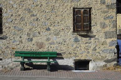 Keywords: green bench in front of the house wall of stone