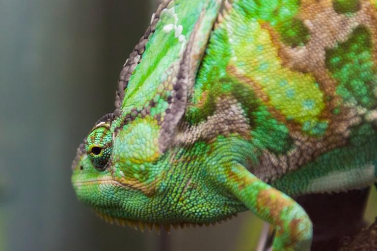 Keywords: green chameleon reptile animal camouflage wild exotic head detail eyes watching