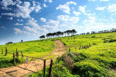 Keywords: green grass field gate trees blue sky clouds sunshine sunny summer