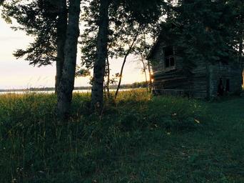 Keywords: green grass rural cottage shed wood trees lake