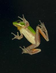Keywords: green tree frog green yellow tiny webbed feet window glass black night native queensland australia