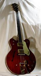 | Keywords: Gretsch Country Gentleman 1.jpg Gretsch Country Gentleman 1964 6122 Chet Atkins Country Gentlemen CANON 2008 Own matanao Hollow body 17 inches wide electric archtop Simulated painted f holes ebony fingerboard Name plate on peghead Metal nut 24 1/4 inch scale Stairstep tuner buttons 2 pickup volume knobs on lower bout one for each pickup 1 master volume knob on cutaway 2 tone switches on upper bout Bigsby vibrato and metal bar bridge Gold plated hardware Zero fret and Bone nut Double cutaway body Padded back Double mute with two large mute knobs on either side of bridge Standby switch added on lower bout 1964 Country Gentlemen specs One Super'tron and one Filter'tron pickup Smaller lever-action mute knobs Gold plated Gretsch Bigsby vibrato Gretsch Country Gentleman 6122 Gretsch 1964 models |