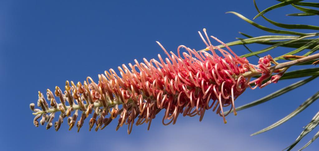 Keywords: grevillea flower australian native pink red nectar shrub garden bloom blue sky