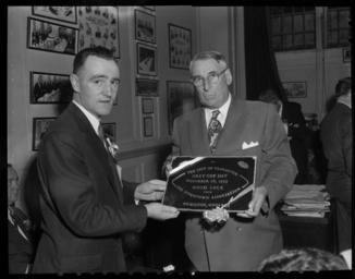 | Keywords: people blackandwhite monochrome indoor black and white Mayor Fred Hume accepts Grey Cup Day plaque from Vic Copps, Downtown Association of Hamilton, Ontario, at the Terminal City Club VPL Accession Number: 82928 Date: 1955 Photographer/Studio: DeWitt, Eric More information on our historical photograph collection: www.vpl.ca/historicalphotos Mayor Fred Hume accepts Grey Cup Day plaque from Vic Copps, Downtown Association of Hamilton, Ontario, at the Terminal City Club VPL Accession Number: 82928 Date: 1955 Photographer/Studio: DeWitt, Eric More information on our historical photograph collection: www.vpl.ca/historicalphotos |