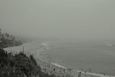 Keywords: grey sky beach sand waves houses water trees people swimming