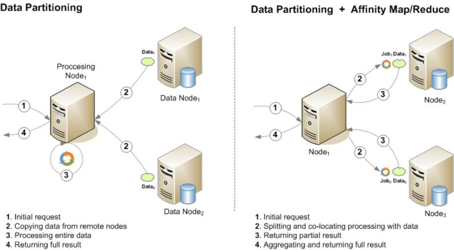| Keywords: Gridgain affinity.png en The diagram illustrates the difference between using data grids without and with GridGain The left side shows execution flow without GridGain in which a remote data server is queried for data the data is then delivered to caller master node which is faster than DB access but results into unnecessary network traffic On the right hand side you can see the value that GridGain brings to the picture The whole computation logic together with data access logic is brought to data server for local execution Assuming that serialization of computation logic is much lighter than serializing data the network traffic in this case is minimal Also your computation may access data from both Node 2 and Node 3 In this case GridGain will split your computation into logical jobs and route appropriate logical jobs to the corresponding data servers to ensure that all computations still remain local Now if one of the data server nodes crashes your jobs will be automatically failed-over to other nodes which allows you to fail-over logic together with data not just data fail-over provided by data grids or distributed caches Own Ne vasya Computer network diagrams |