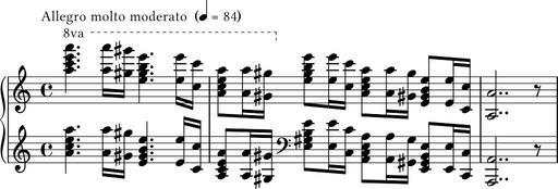 | Keywords: Grieg piano concerto in A minor opening.svg email me you don't need to say why and I'll be happy to provide it for you Re-typsetting of File Piano Concerto in A minor Op 16; Introduction png Typeset by RainCity471 using GNU/Lilypond 2013-11-27 concerto first published 1872 File Piano Concerto in A minor Op 16; Introduction png This file cc0 The concerto PD-old-100 File this version is based on Egemont Source code To compile this file as a SVG enter lilypond --define-defaut backend SVG <path-to-file> at the command line command prompt in Windows and Terminal in Linux/Mac I think If you're like me and don't have the <code>lilypond</code> keyword defined use <path-to-lilypond exe> --define-default backend SVG <path-to-file> <source lang latex> \version 2 16 2 \new PianoStaff piano << \new Staff rightHand \tempo Allegro molto moderato 4 84 \clef treble \time 4/4 \key a \minor \relative c' \ottava 1 <a c e a>4 <a a'>16 <gis gis'> <e' b gis e>4 <e e >16 <c c > <a e c a>8 <a a >16 <gis gis > \ottava 0 <e b gis e>8 <e e >16 <c c > <a e c a>8 <a a >16 <gis gis > <e b gis e>8 <e e >16 <c c > <a a >2 r8 \new Staff leftHand \clef treble \time 4/4 \key a \minor \relative c <a c e a>4 <a a'>16 <gis gis'> <e' b gis e>4 <e e >16 <c c > <a e c a>8 <a a >16 <gis gis > \clef bass <e b gis e>8 <e e >16 <c c > <a e c a>8 <a a >16 <gis gis > <e b gis e>8 <e e >16 <c c > <a a >2 r8 >> </source> Sheet music of Edvard Grieg Piano Concerto in A minor Op 16 Grieg Piano concertos |