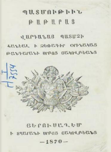 | Keywords: Grigor Aknertsi.jpg  ru Обложка издания «Исто ии на ода ст елков» а мянского исто ика XIII века Г иго а Акне ци https //ru wikipedia org/wiki/ D0 A4 D0 B0 D0 B9 D0 BB GrigorAknertsi jpg author 1870 PD-old-100 Armenian historiography 19th century Armenian printing |