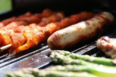 Keywords: grill flares bratwurst barbecue meat charcoal party embers asparagus