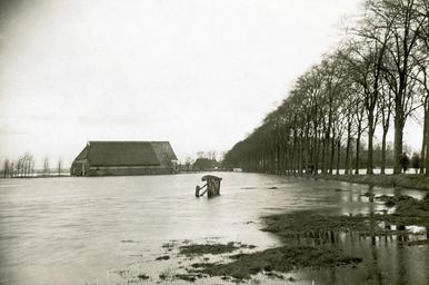 Op den weg groepen eenige kijkers samen. Zij praten over het onheil, dat de streek getroffen heeft. Meewarig zien ze naar de huizen aan den weg, die men aanvankelijk, door het grootsche van het schouwspel, nauwelijks heeft opgemerkt. De menschen daarbinnen, allen eilandbewoners nu, gluren door de ruiten. Een enkele waagt zich naar buiten, met moeite zich een weg banend over de smalle, zwiepende plankjes, die op enkele plaatsen reeds geheel overspoeld zijn. Eenige jongens maken er een pretje van, ze springen van plank tot plank, hun schoenen glippen in het water, zoodat de druppels hoog op spatten en hun kousen klam, vochtig maken. En dan vertelt een meedeelzame boer of een vriendelijk vrouwtje van die vreeselijke winterellende, die nooit nog zoo erg was als nu en zij wijzen het huis, waarin het water wel een voet gestegen is en waar de bewoners een toevlucht op den zolder moesten zoeken. En men noemt het een schande, dat nog niets gedaan is om die jaarlijksche overstromingen tegen te gaan. De bezoeker kan niet anders dan deze klacht in stilte beamen. En dan verlaat hij de plek, waar, nu de zon haar alles vermoeiend schijnsel niet meer zendt, een trieste troosteloosheid heerscht.