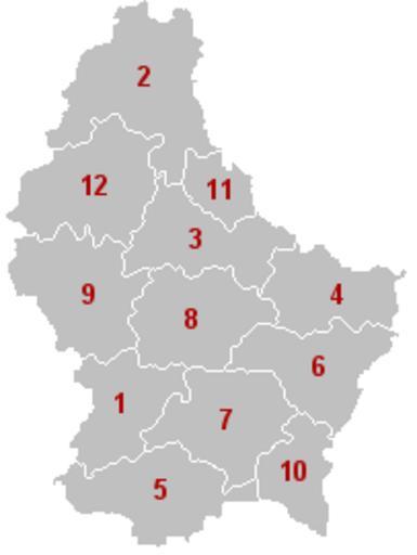 Keywords: Groothertogdom LuxemburgKantons.png ----- Nr Canton/Kanton District ----- 1 Capellen Luxembourg ----- 2 Clervaux Diekirch ----- 3 Diekirch Diekirch ----- 4 Echternach Grevenmacher ----- 5 Esch-sur-Alzette Luxembourg ----- 6 Grevenmacher Grevenmacher ----- 7 Luxembourg Luxembourg ----- 8 Mersch Luxembourg ----- 9 Redange Diekirch ----- 10 Remich Grevenmacher ----- 11 Vianden Diekirch ----- 12 Wiltz Diekirch Mapa de Luxemburgo indicando la división territorial en cantones Cada número corresponde a un cantón en la lista de la izquierda Map of the cantons in the Grand Duchy of Luxembourg Kaart van de kantons in het Groothertogdom Luxemburg Carte des cantons du Grand-Duché de Luxembourg - was Kantonskaart eigen werk LennartBolks Maps of cantons of Luxembourg