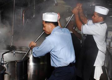 | Keywords: Großküche-USS Tarawa.jpg 070502-N-1786N-005 SAN DIEGO May 2 2007 - Culinary Specialist 1st Class Teofilo Izon and Culinary Specialist 3rd Class Brodrieon Jones help prepare a meal during a Supply Maintenance Certification SMC inspection aboard USS Tarawa LHA 1 The ship ™s culinary specialists are going through an annual inspection where everything from supply books to sanitation is checked Text by U S Navy http //www navy mil/view_image asp id 46001 2007-05-02 Mass Communication Specialist Seaman Bryan Niegel PD-USGov Staff canteens in Germany Side caps Cooking Men at work in the United States 2007 photographs Uploads by Mattes from external sources Galley of the USS Tarawa LHA-1 Tarawa |