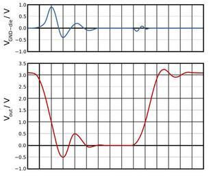 Keywords: Ground Bounce.svg en A graph showing the on-die ground reference voltage and the output voltage during a transition of the output Own Inductiveload 2009-05-02 Digital circuits